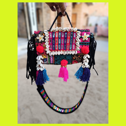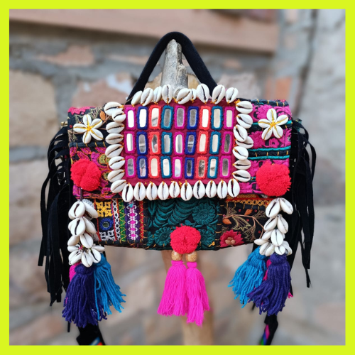 Materials: Antique Banjara textiles, leather, mirror work, cowrie shells