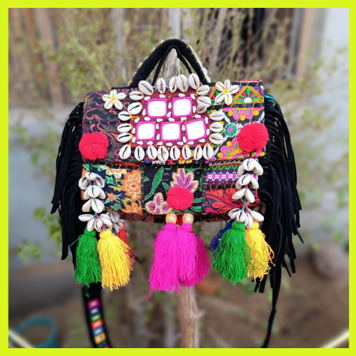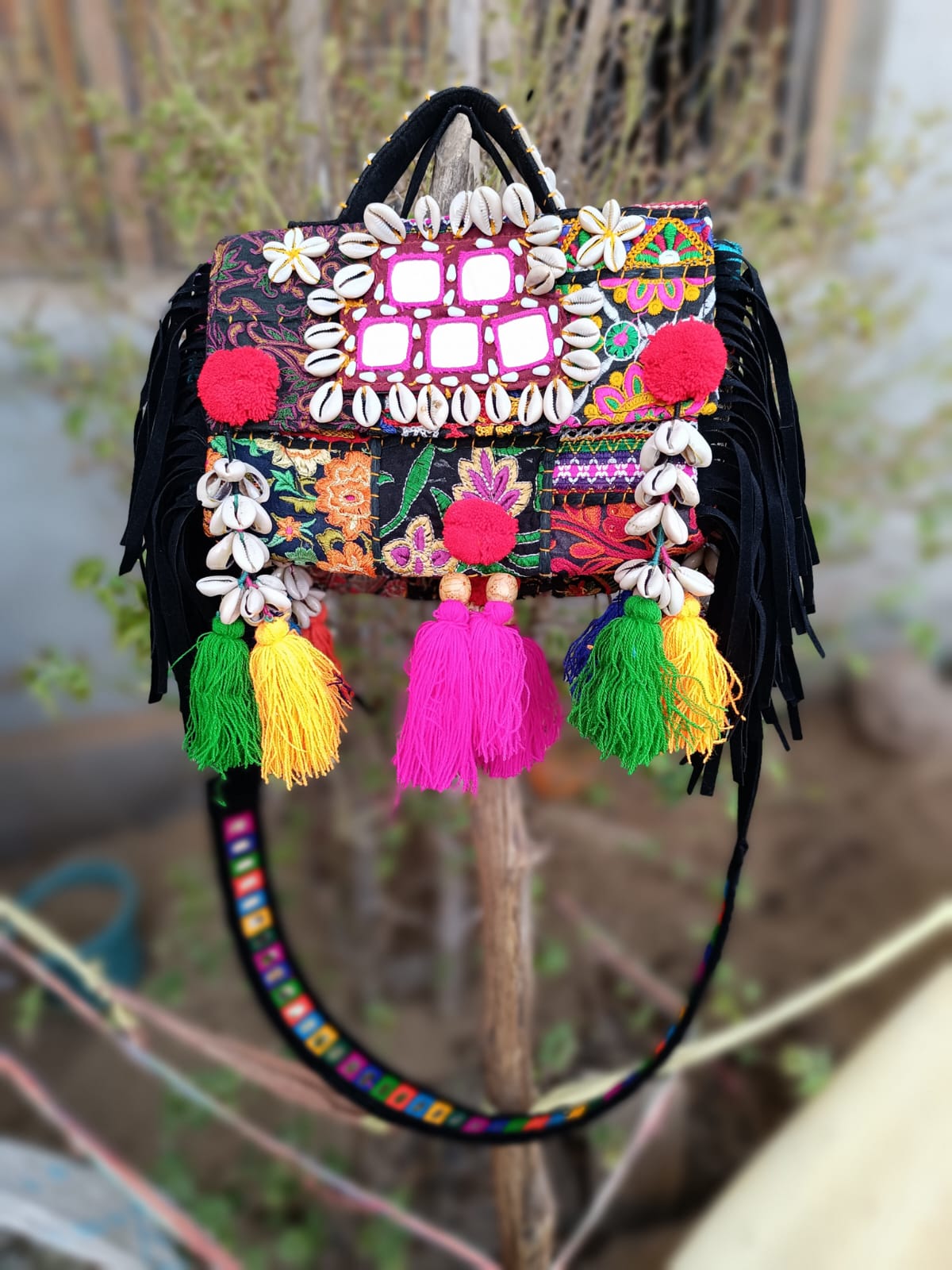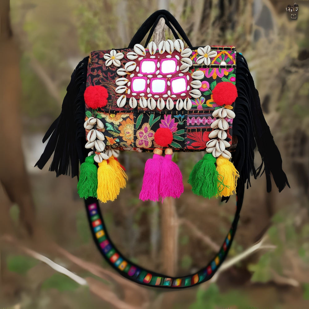 Handcrafted by Kutch artisans, this bold Banjara bag fuses vintage fabrics and leather for a stunning bohemian look. Perfect for festivals or daily style, it pairs beautifully with Western or Indian wear.