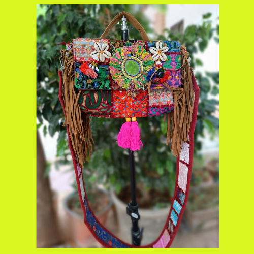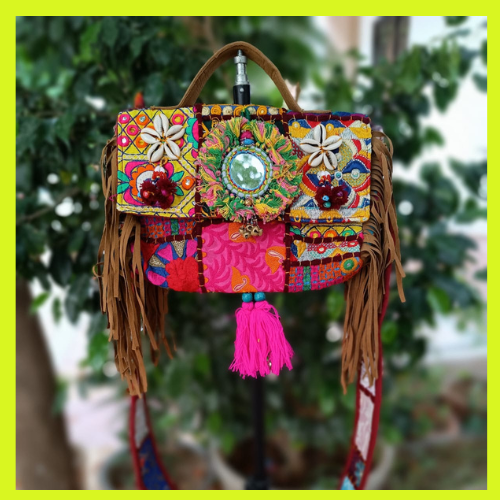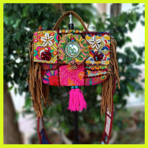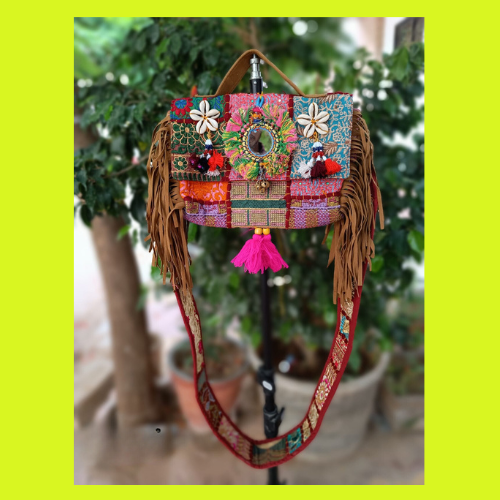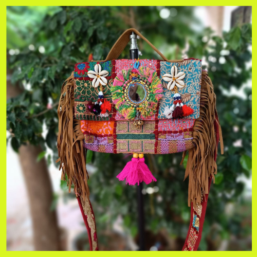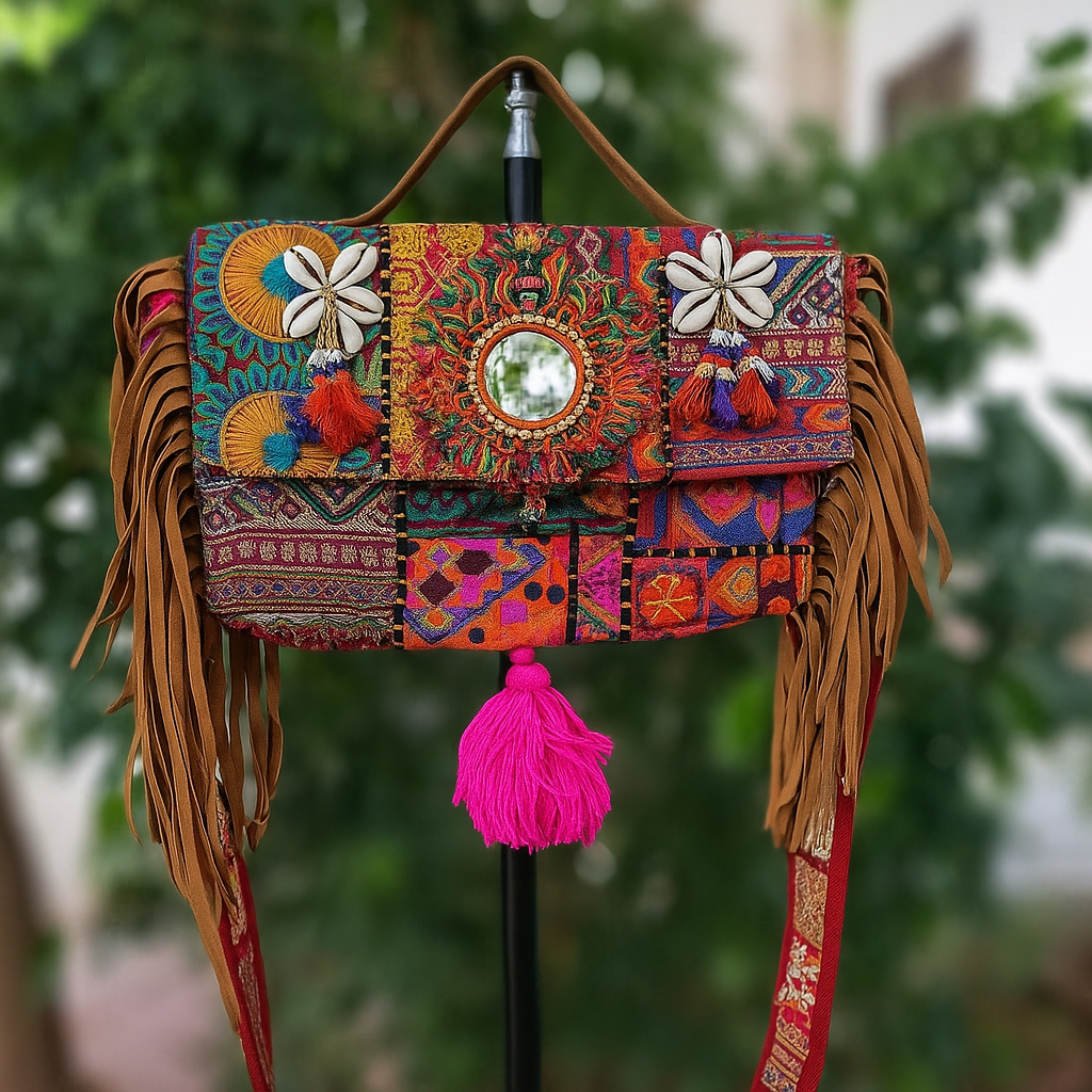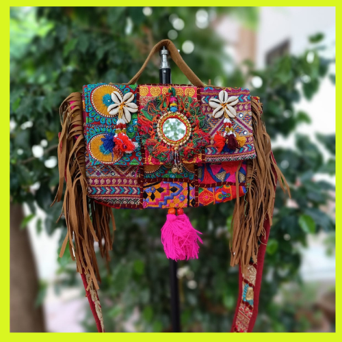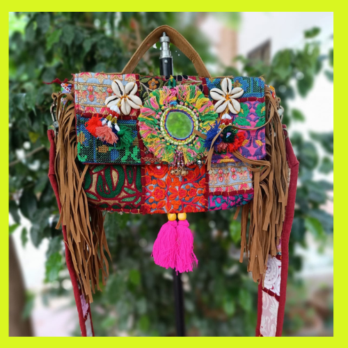 - Made from: Upcycled Banjara fabric, leather, mirror detailing, cowrie shell embellishments