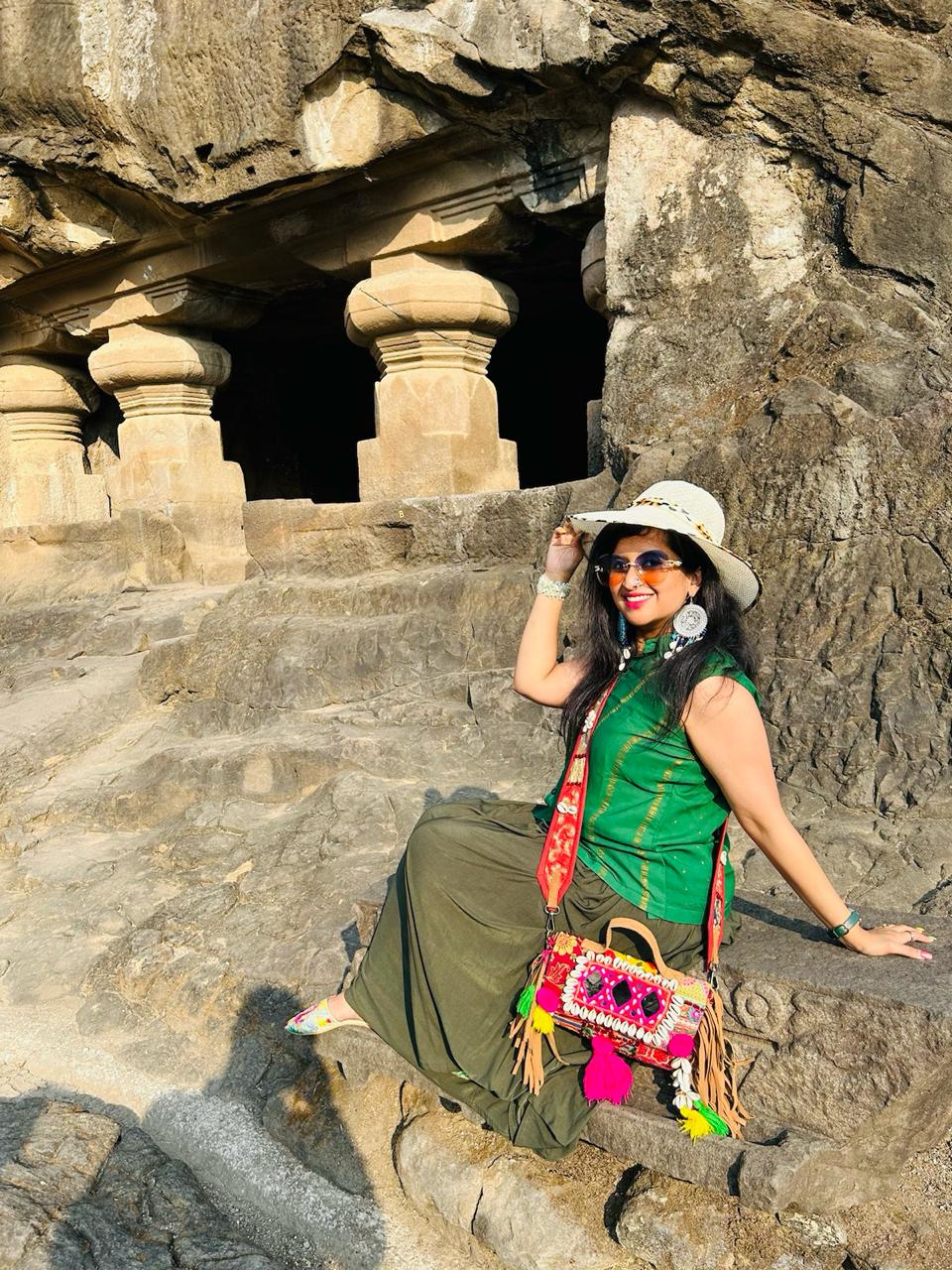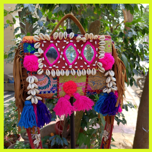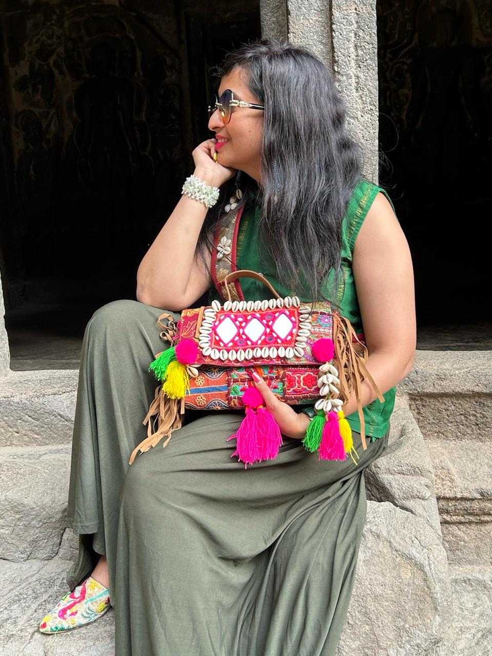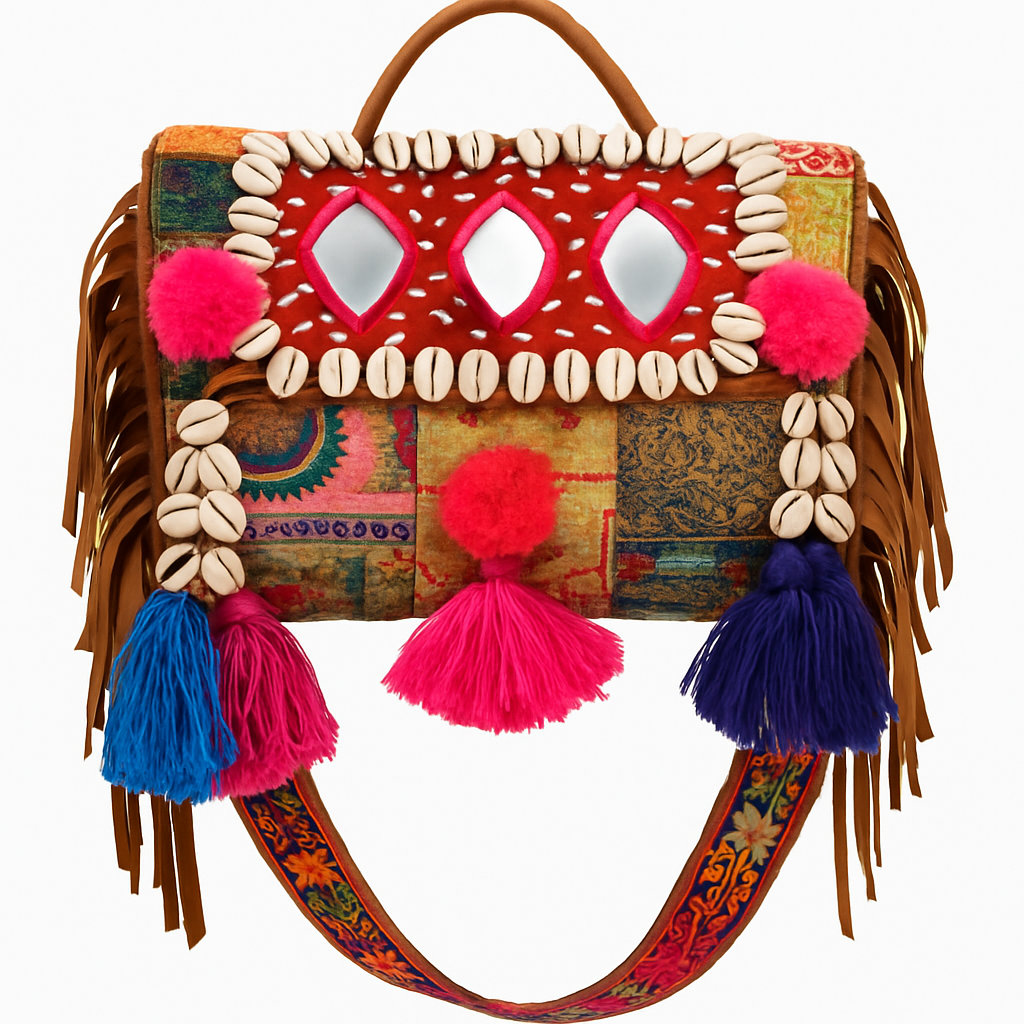 Materials: Upcycled Banjara textiles, genuine leather, mirror accents & cowrie shells